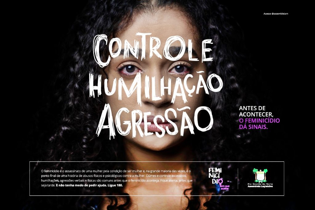 Firmando posicionamento no combate ao feminicídio e violência contra a mulher, a Assembleia Legislativa do Rio Grande do Norte divulga campanha publicitária com alerta quanto aos perigos de uma relação com traços que podem evoluir a um feminicídio, como ciúmes e controle excessivo; humilhações; agressões verbais e físicas; abusos físicos e psicológicos e o último, atentado à vida da mulher.