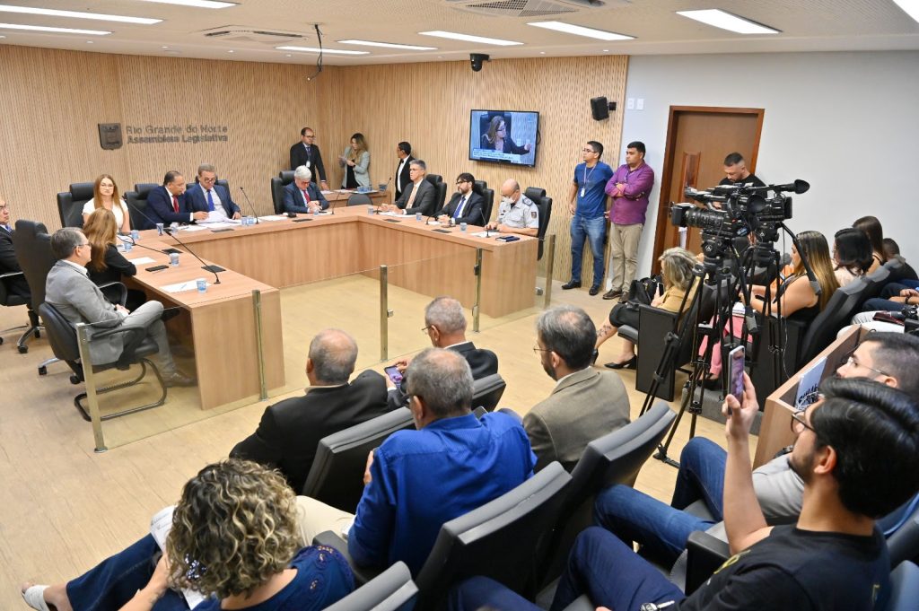 Os membros da Comissão de Administração, Serviços públicos, Trabalho e Segurança Pública da Assembleia Legislativa reuniram-se extraordinariamente nesta quinta-feira (20). Proposta pelo deputado Luiz Eduardo (SDD), a reunião aconteceu em formato de audiência pública e levou à sala das Comissões, a cúpula da Segurança Pública do Rio Grande do Norte para prestar informações a respeito da crise registrada no Estado, no mês de março, quando bandidos praticaram atos criminosos contra instituições e equipamentos públicos. Durante a audiência foram fornecidos o balanço geral de ocorrências, números de prisões, permanência em cárcere, estratégia de mitigação e ações de contenção em geral tomadas pelo governo do estado durante os 11 dias de crise.