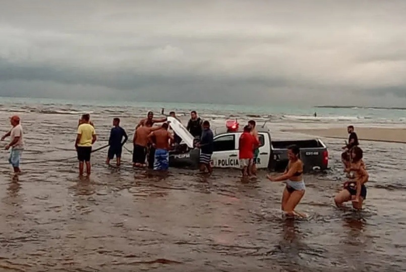 Segundo a Polícia Militar, a tração do veículo falhou no momento em que a viatura estava passando por uma área com volume de água, percurso feito também por outros veículos. Para retirar o veículo do mar, os policiais contaram com o apoio de populares, que auxiliaram com um veículo 4×4. O carro foi recolhido para o posto policial da região e passará por manutenção.