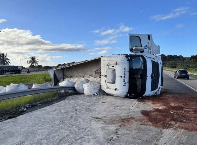 Um caminhão carregado com cimento tombou na madrugada desta sexta-feira (18) na BR-101 na cidade de São José de Mipibu, na Região Metropolitana de Natal. Por conta do acidente, apenas a faixa do acostamento ficou liberada, causando um cogestionamento na estrada.