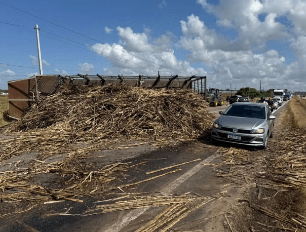Um caminhão carregado de cana-de-açúcar tombou e causou a interdição parcial da BR-101, em São José e Mipibu, na Grande Natal, na manhã desta terça-feira (21). Segundo a Polícia Rodoviária Federal, o acidente aconteceu por volta das 5h40 na altura do quilômetro 127, em direção a João Pessoa.