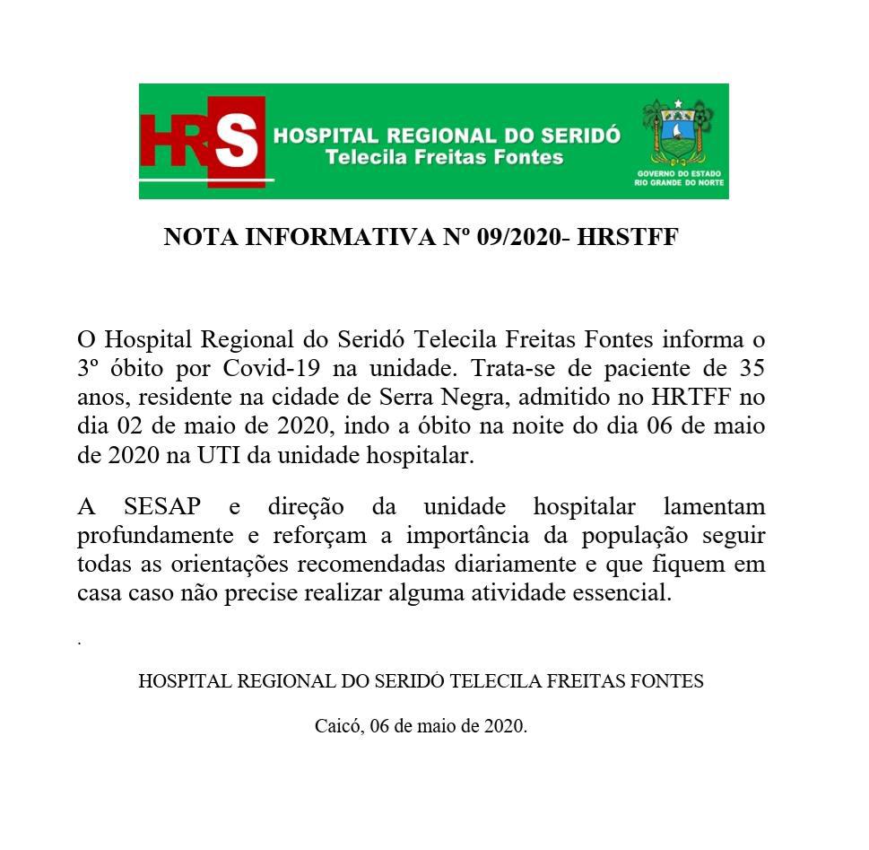 Em nota, Hospital Regional confirma terceira morte por Coivd-19 no Seridó
