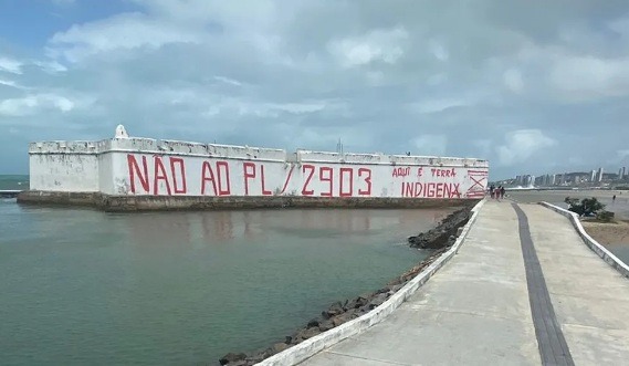 Um dos muros do Forte recebeu as seguintes frases: “Não ao PL/2903” e “Aqui é terra indígena”. A pichação foi feita com tinta vermelha e é possível de ser observada nas imediações da Praia do Forte e também pela avenida Café Filho, entre as Praias do Forte e do Meio, na zona Leste da cidade.