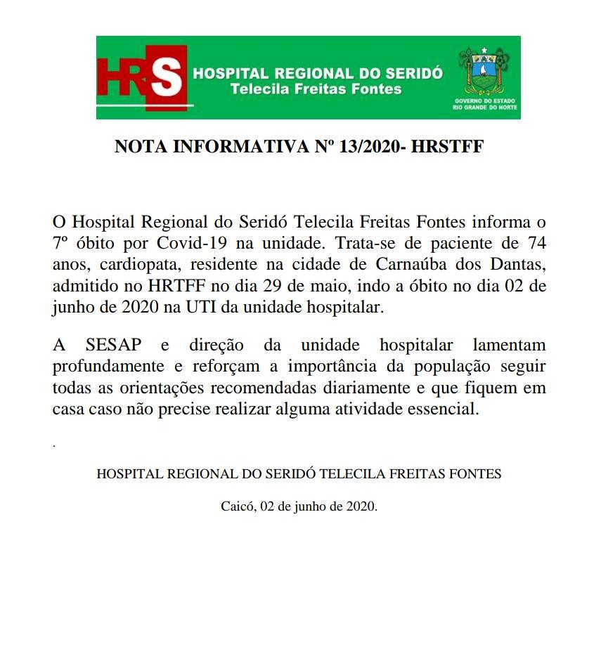 2 de junho de 2020 Hospital Regional do Seridó confirma 7ª morte por Covid-19; paciente é de Carnaúba dos Dantas