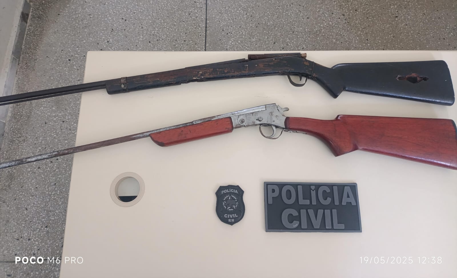 Durante o cumprimento do mandado, foram apreendidas duas armas de fogo, o que resultou na autuação em flagrante do suspeito pelo crime de posse ilegal de arma de fogo, conforme previsto no Estatuto do Desarmamento. O preso foi conduzido à delegacia para os procedimentos legais cabíveis e, em seguida, será encaminhado ao sistema prisional, onde permanecerá à disposição da Justiça.