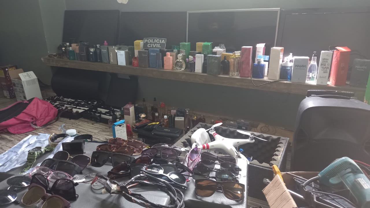 Na residência do suspeito de receptação, foi apreendido o seguinte material: armas de fogo e munições, televisores, diversos óculos escuros e de grau, perfumes, artigos eletrônicos, relógios, utensílios domésticos e tênis.
