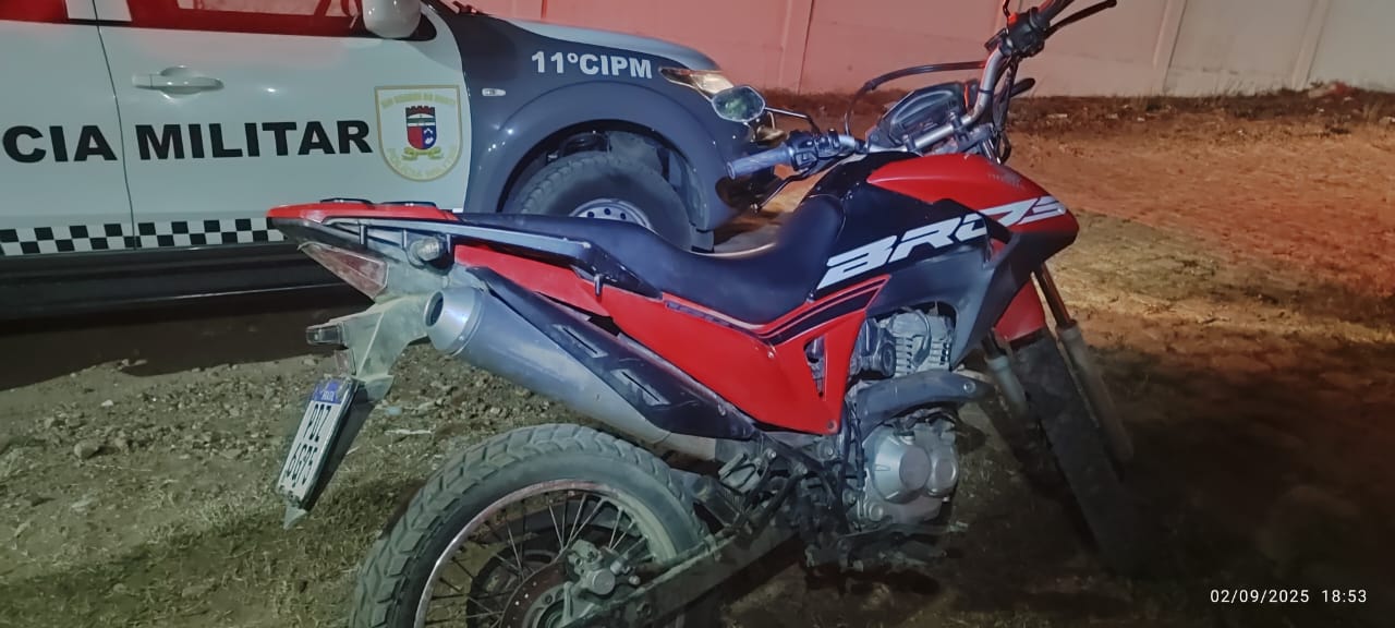 Diante da situação, a motocicleta foi apreendida e encaminhada à Delegacia de Polícia Civil, onde foram adotadas as medidas cabíveis para a restituição ao legítimo proprietário.