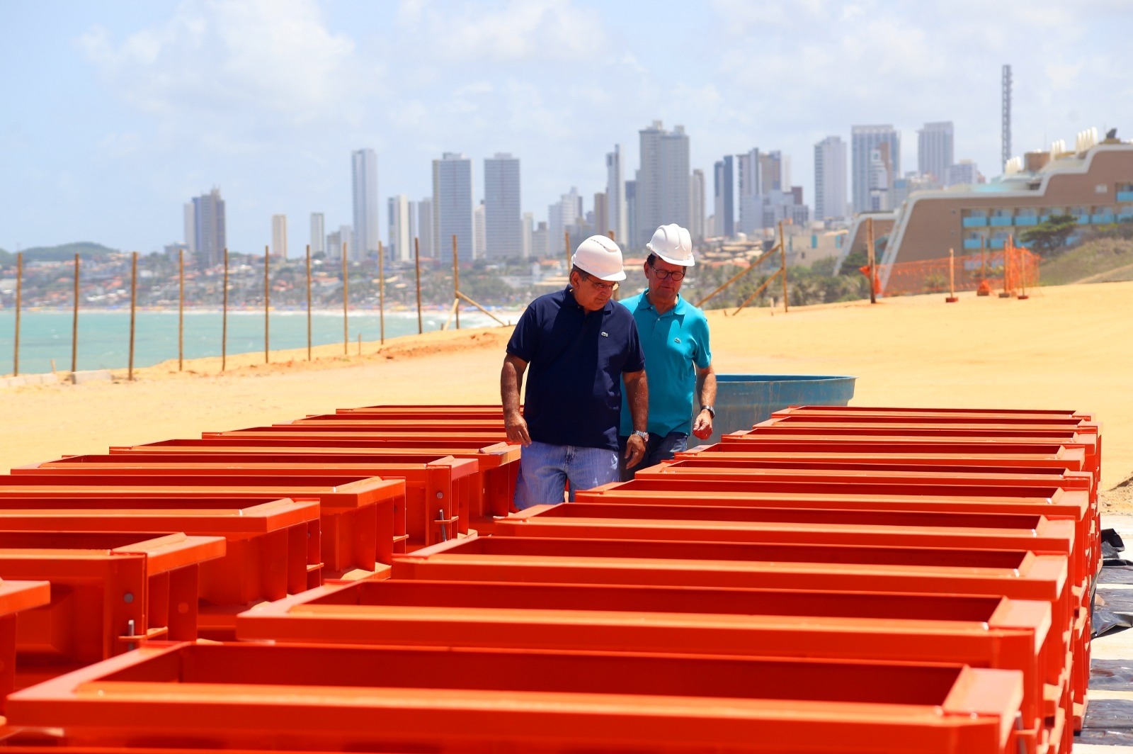 Nesta sexta-feira (03), o prefeito de Natal, Álvaro Dias, percorreu os canteiros de obras que a gestão municipal está executando em diversas regiões da cidade. Ao lado do secretário municipal de Infraestrutura (Seinfra), Carlson Gomes, ele inspecionou a chegada das estruturas utilizadas para a fabricação dos blocos que serão utilizados na sequência do projeto de enrocamento da Praia de Ponta Negra.