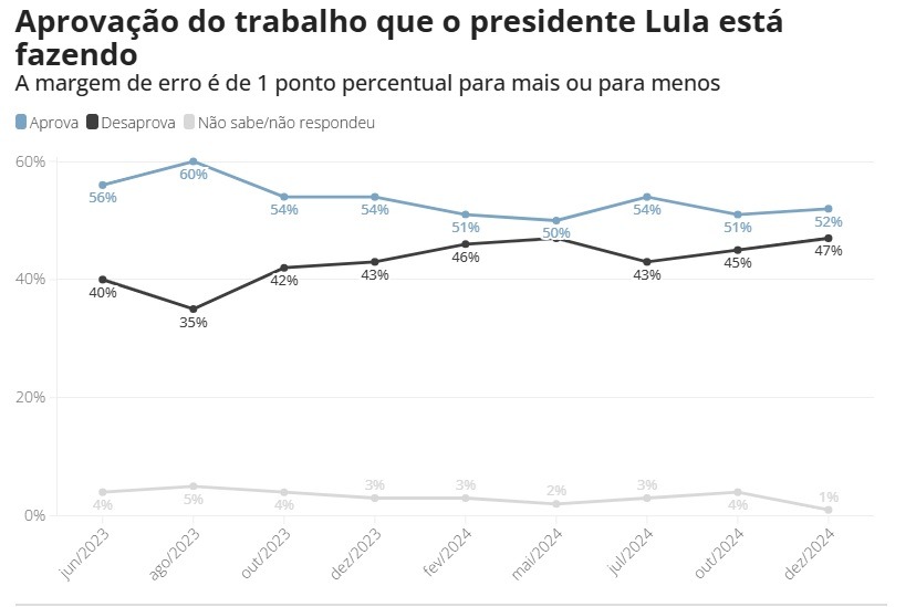 Pesquisa Quaest divulgada nesta quarta-feira (11) aponta que o trabalho do presidente Lula (PT) é aprovado por 52% dos eleitores brasileiros e reprovado por 47%. Outros 1% não sabem ou não responderam. O levantamento foi encomendado pela Genial Investimentos e realizado entre os dias 4 e 9 de dezembro. A margem de erro é de 1 ponto percentual, para mais ou para menos.