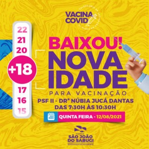 A Prefeitura Municipal de São João do Sabugi é a primeira cidade do Seridó Potiguar a anunciar em suas redes sociais que irá vacinar contra o Covid-19, a população geral, sem comorbidades a partir de 18 anos nesta quinta, 12 de agosto. O anúncio foi feito nas redes sociais do prefeito Anibal Pereira.